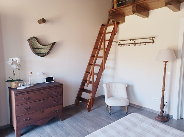 22 mq al piano terra, allestito con un confortevole letto matrimoniale, mobilio e accessori in legno massello e ferro battuto, a cui si aggiungono 10 mq di soppalco per il relax e il tempo libero, o per l’allestimento di un divano letto a due posti.